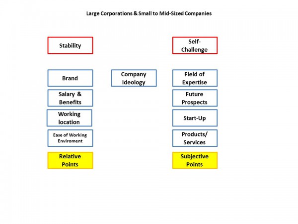If you want to work in your field of expertise, or challenge yourself by becoming an entrepreneur, small/medium companies might be for you. The benefits of working for a small or medium-sized company is that their aim in hiring you is often clear, and the scope of the work will be broad. I’d also like to point out that the starting salaries at large and smaller companies are about the same.