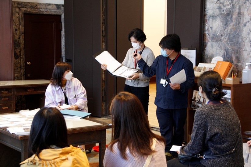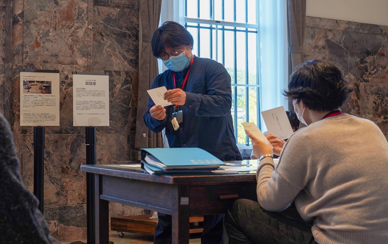 館内見学の後は、「談話室」にて、ラーニング・キュレーターのお二人から留学生に向けて、「対話」についてのお話をしていただきました。