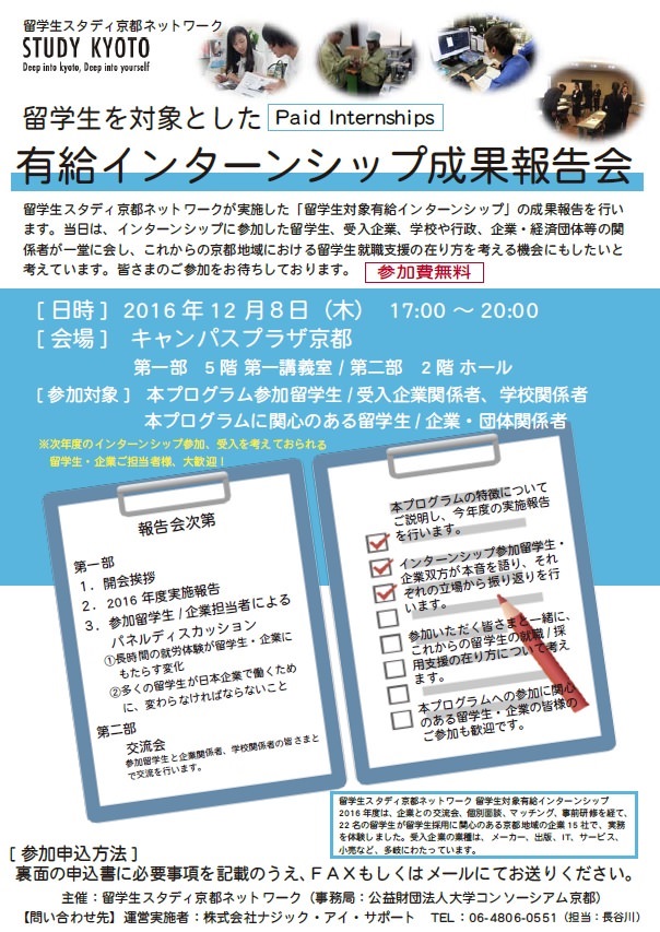 留学生スタディ京都ネットワークが2016年9月~11月にかけて実施した「留学生対象有給インターンシップ」の成果報告会を行います。当日は、インターンシップに参加した留学生、受入企業、学校や行政、企業・経済団体等の関係者が一堂に会し、これからの京都地域における留学生就職支援の在り方を考える機会にもしたいと考えています。皆様のご参加をお待ちしています。報告会の中では、インターンに参加した留学生と受入企業関係者が登壇するパネルディスカッションを実施いたします。率直な意見を出し合い、日本で多くの留学生が働くために、留学生が変わらなければならないこと、企業が変わらなければならないことを本音で語り合います。本プログラムに興味のある留学生や学校関係者はもちろん、留学生採用に興味のある企業の皆様もご参加ください!