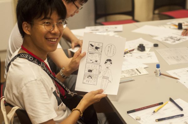 ในช่วงบ่าย เป็นกิจกรรมเวิร์คชอปวาดการ์ตูนมังงะ 4 ช่อง ที่พิพิธภัณฑ์มังงะ โดยมีอาจารย์จากภาควิชามังงะ มหาวิทยาลัยเกียวโตเซกะ (Kyoto Seika University) เป็นผู้แนะนำในการเวิร์คชอป