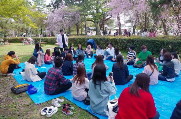4月に入って、桜が京都のあっちこっちに見え始めてくると、留学生会は京都御所で花見を行います。留学生会委員団が主催する花見では、みんなで楽しいゲームをしたり、おいしい弁当をみんなで一緒に食べたりしながら留学生同士の仲を深めていきます。