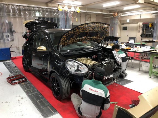 実習場で出会った学生たちは、2019年2月に開催された「大阪オートメッセ」に出展される車両、「IM-R」のカスタマイズに力を入れていました。日産「マーチ」のボンネットの裏側に紅葉の葉っぱを一枚一枚貼って、京都らしさをとても美しく表現しました。そして大阪オートメッセでは、人気車両コンテストの結果、出展された596台の中で、なんと2位に輝きました!すごい技術力ですね!